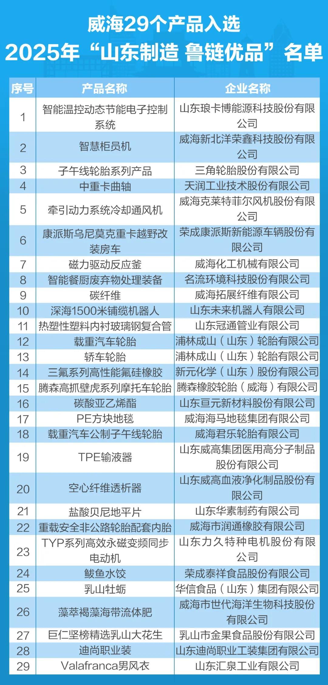 近日,省工业和信息化厅公布2025年“山东制造 鲁链优品”名单(第一批),威海新北洋荣鑫科技股份有限公司的智慧柜员机、天润工业技术股份有限公司的中重卡曲轴、山东未来机器人有限公司的深海1500米铺缆机器人、山东威高血液净化制品股份有限公司的“空心纤维透析器”等29个威海产品入选。