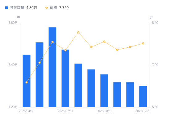 近一年(2024年12月31日至2025年12月31日),新北洋A股股东户数从4.81万户,减低至4.8万户,降幅0.23%,区间股价上涨17.61%。