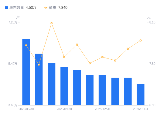 近一年(2025年1月31日至2026年1月31日),新北洋A股股东户数从4.7万户,减低至4.53万户,降幅3.58%,区间股价上涨25.36%。