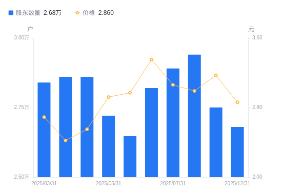 近一年(2024年12月31日至2025年12月31日),国创高新A股股东户数从2.85万户,减低至2.68万户,降幅5.87%,区间股价下跌18.52%。