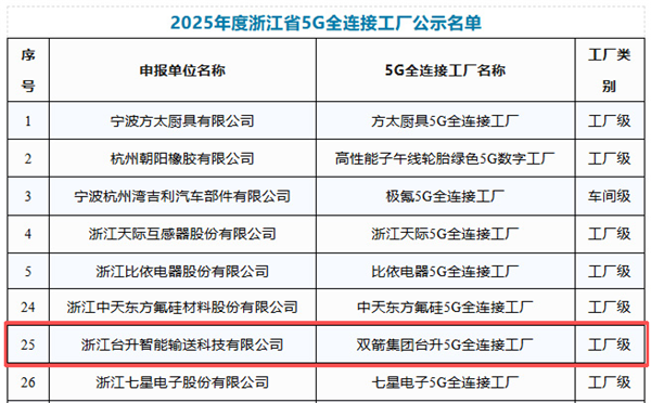 近日,浙江省经济和信息化厅正式公示2025年度“浙江省5G全连接工厂”拟入选名单。浙江双箭橡胶股份有限公司全资子公司——浙江台升智能输送科技有限公司(以下简称“台升智能”)凭借其在智能制造与数字化转型方面的卓越表现,成功入选。值得注意的是,台升智能是本批次中橡胶输送带领域唯一入选的企业,标志着其在5G融合应用与未来工厂建设方面已走在全省乃至全国行业前列。