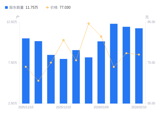 近一年(2025年2月10日至2026年2月10日),东山精密A股股东户数从8.24万户,增加至11.75万户,增幅42.48%,区间股价上涨141.47%。