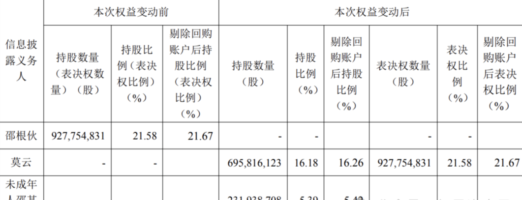 同时,公告显示,鉴于莫云女士是未成年女儿邵某某的法定监护人,未成年女儿邵某某持有的公司股份的权利由莫云行使,莫云合计持有公司表决权9.28亿股,占公司有表决权股份总数的比例为21.58%,足以对公司股东会决议产生重大影响。因此,本次权益变动后,公司控股股东、实际控制人变更为莫云女士。