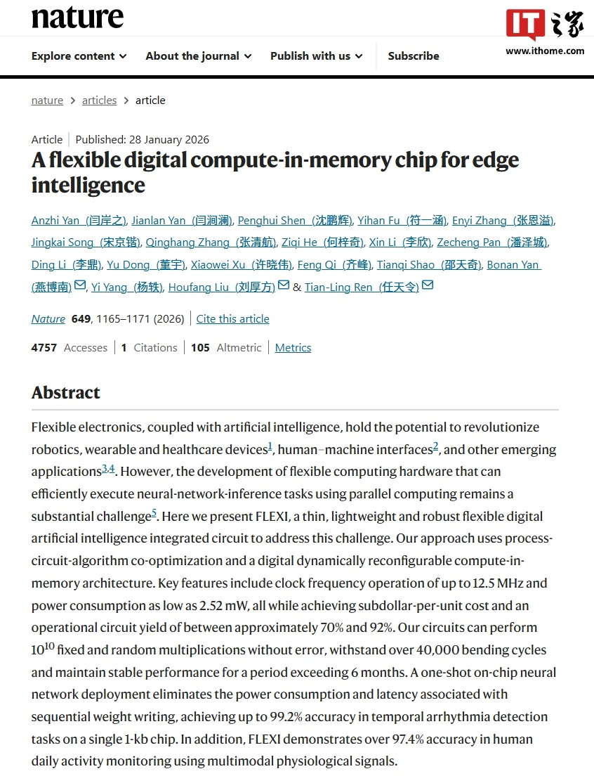 IT之家 2 月 10 日消息,维信诺(002387)官方昨日发文分享,1 月 28 日,清华大学联合北京大学与维信诺合作开发了世界首款柔性存算芯片 —— FLEXI,相关成果以《A flexible digital compute-in-memory chip for edge intelligence》为题在国际顶级期刊《自然》(Nature)上发表。