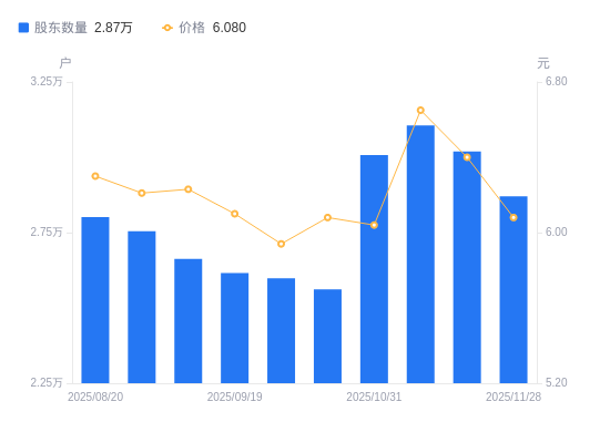 近一年(2024年11月29日至2025年11月28日),长青股份A股股东户数从2.54万户,增加至2.87万户,增幅12.90%,区间股价上涨14.29%。