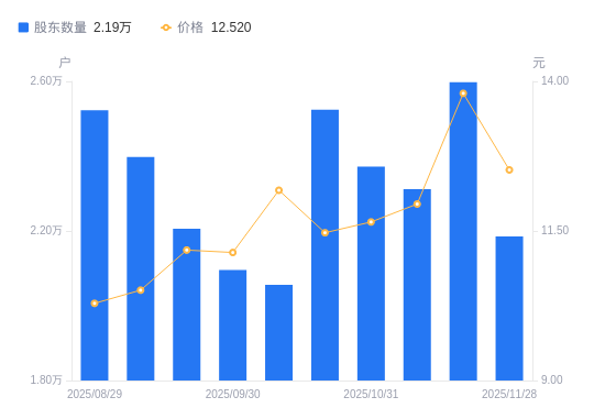 12月1日消息,数据显示,截至2025年11月28日,联发股份A股股东总户数为2.19万户,较上期(2025年11月20日)减少4123户,降幅15.87%。公司最新A股总股本为3.24亿股,其中流通A股3.23亿股,户均持有流通A股数量为1.48万股,较上期增加2347.7股,增幅18.87%;户均持流通A股市值18.52万元,较上期增加1.35万元,增幅7.84%。