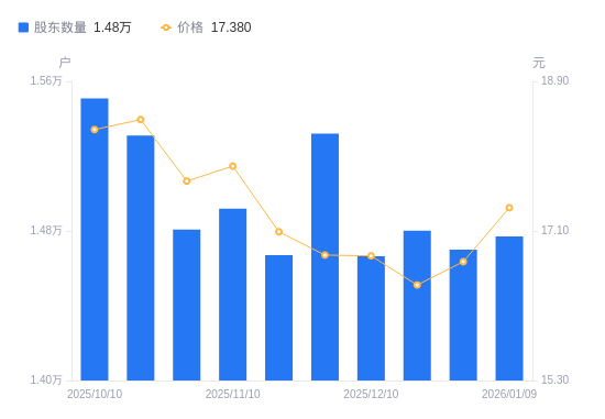 近一年(2025年1月10日至2026年1月9日),双象股份A股股东户数从1.64万户,减低至1.48万户,降幅10.09%,区间股价上涨9.79%。