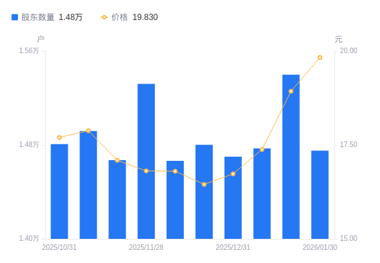 近一年(2025年2月10日至2026年1月30日),双象股份A股股东户数从1.57万户,减低至1.48万户,降幅5.76%,区间股价上涨14.96%。