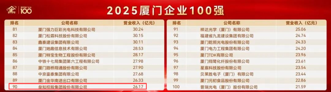 近日,2025年度“厦门企业百强”及“厦门专精特新企业十强”榜单正式发布。