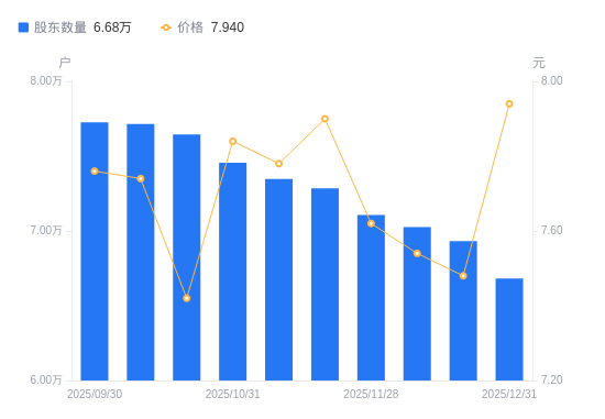 1月14日消息,数据显示,截至2026年1月9日,远东传动A股股东总户数为6.45万户,较上期(2025年12月31日)减少2281户,降幅3.41%。公司最新A股总股本为7.3亿股,其中流通A股6.02亿股,户均持有流通A股数量为9330.7股,较上期增加318.51股,增幅3.53%;户均持流通A股市值7.51万元,较上期增加3555.33元,增幅4.97%。