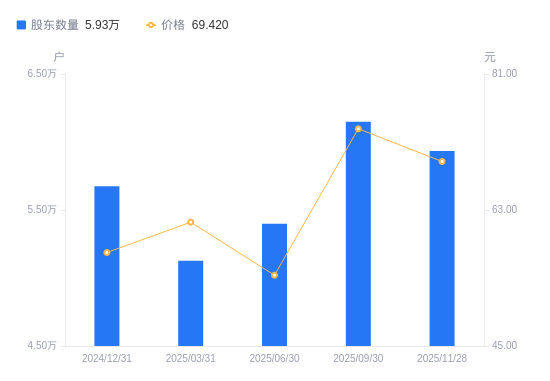 近一年(2024年12月31日至2025年11月28日),雅克科技A股股东户数从5.67万户,增加至5.93万户,增幅4.58%,区间股价上涨15.70%。