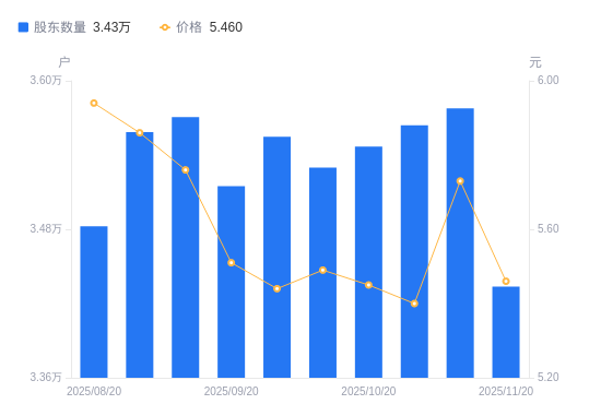 近一年(2024年11月20日至2025年11月20日),天虹股份A股股东户数从3.35万户,增加至3.43万户,增幅2.38%,区间股价上涨6.02%。