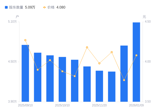 近一年(2025年1月10日至2026年1月9日),凯撒文化A股股东户数从6.14万户,减低至5.09万户,降幅17.06%,区间股价上涨93.36%。