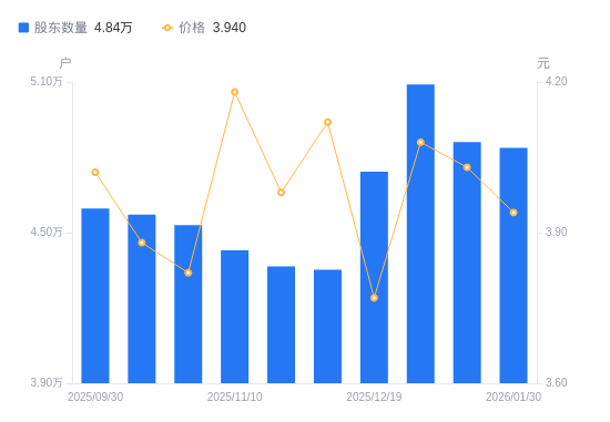 2月10日消息,数据显示,截至2026年1月30日,凯撒文化A股股东总户数为4.84万户,较上期(2026年1月20日)减少236户,降幅0.49%。公司最新A股总股本为9.57亿股,其中流通A股9.56亿股,户均持有流通A股数量为1.98万股,较上期增加95.97股,增幅0.49%;户均持流通A股市值7.79万元,较上期减少1392.13元,降幅1.76%。