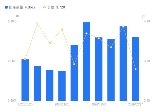 近一年(2025年2月28日至2026年2月27日),凯撒文化A股股东户数从5.73万户,减低至4.86万户,降幅15.12%,区间股价上涨60.34%。