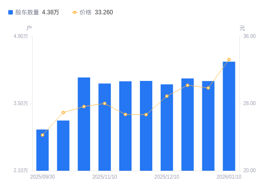 1月13日消息,数据显示,截至2026年1月10日,杭氧股份A股股东总户数为4.38万户,较上期(2025年12月31日)增加4046户,增幅10.19%。公司最新A股总股本为9.78亿股,其中流通A股9.78亿股,户均持有流通A股数量为2.24万股,较上期减少2277.16股,降幅9.25%;户均持流通A股市值74.34万元,较上期增加7747.89元,增幅1.05%。