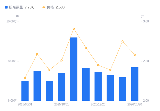 近一年(2025年3月31日至2026年1月20日),棕榈股份A股股东户数从6.48万户,增加至7.7万户,增幅18.81%,区间股价上涨29.00%。