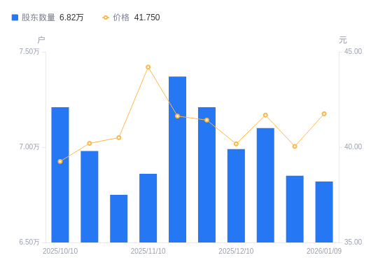 1月14日消息,数据显示,截至2026年1月9日,九安医疗A股股东总户数为6.82万户,较上期(2025年12月31日)减少300户,降幅0.44%。公司最新A股总股本为4.65亿股,其中流通A股4.64亿股,户均持有流通A股数量为6808.1股,较上期增加29.82股,增幅0.44%;户均持流通A股市值28.42万元,较上期增加1.28万元,增幅4.73%。