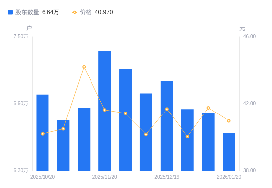 1月21日消息,数据显示,截至2026年1月20日,九安医疗A股股东总户数为6.64万户,较上期(2026年1月9日)减少1800户,降幅2.64%。公司最新A股总股本为4.65亿股,其中流通A股4.64亿股,户均持有流通A股数量为6993.29股,较上期增加185.19股,增幅2.72%;户均持流通A股市值28.65万元,较上期增加2276.83元,增幅0.80%。