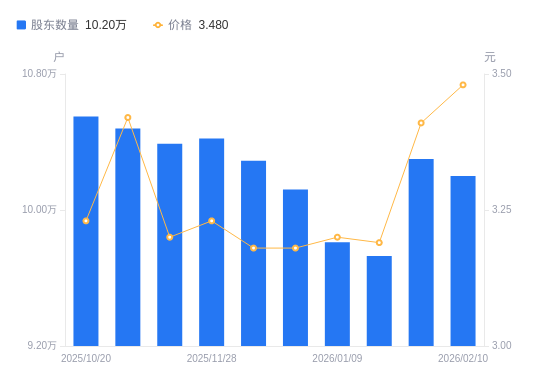 近一年(2025年2月10日至2026年2月10日),誉衡药业A股股东户数从9.35万户,增加至10.2万户,增幅9.09%,区间股价上涨35.94%。