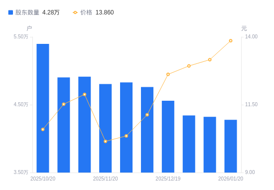1月21日消息,数据显示,截至2026年1月20日,中原内配A股股东总户数为4.28万户,较上期(2026年1月9日)减少435户,降幅1.01%。公司最新A股总股本为5.88亿股,其中流通A股4.56亿股,户均持有流通A股数量为1.06万股,较上期增加107.18股,增幅1.02%;户均持流通A股市值14.76万元,较上期增加8864.19元,增幅6.39%。