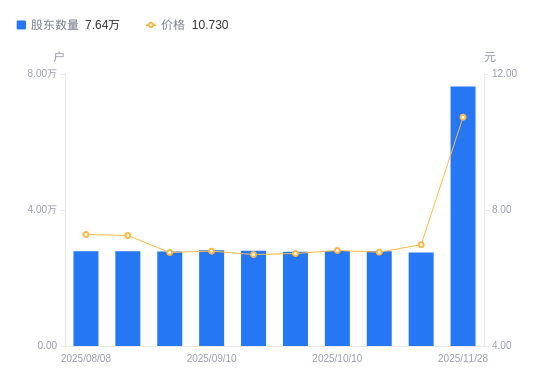 近一年(2024年12月10日至2025年11月28日),摩恩电气A股股东户数从3.66万户,增加至7.64万户,增幅108.57%,区间股价上涨40.45%。