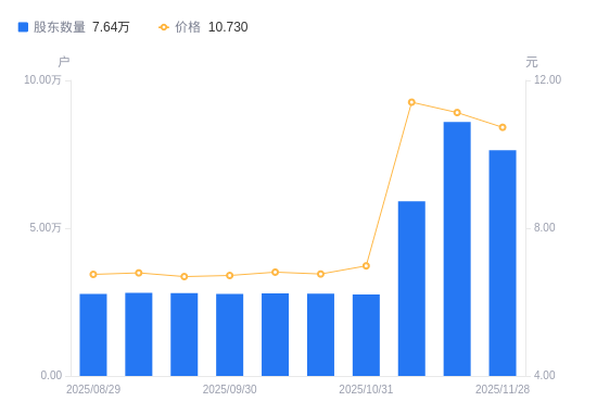 12月4日消息,数据显示,截至2025年11月10日,摩恩电气A股股东总户数为5.91万户,较上期(2025年10月31日)增加3.16万户,增幅114.80%。公司最新A股总股本为4.41亿股,其中流通A股4.39亿股,户均持有流通A股数量为7425.21股,较上期减少8524.13股,降幅53.45%;户均持流通A股市值8.47万元,较上期减少2.66万元,降幅23.90%。