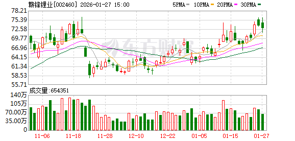 截至1月27日收盘,赣锋锂业跌0.99%,报72.91元/股,总市值1528亿元。