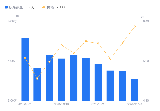 近一年(2024年11月20日至2025年11月20日),宝莫股份A股股东户数从4.43万户,减低至3.55万户,降幅19.73%,区间股价上涨41.57%。
