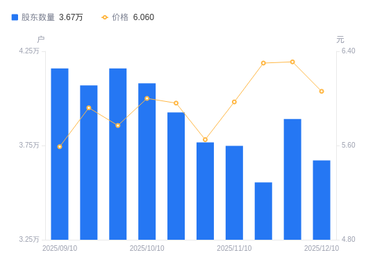 近一年(2024年12月10日至2025年12月10日),宝莫股份A股股东户数从4.32万户,减低至3.67万户,降幅14.97%,区间股价上涨23.67%。