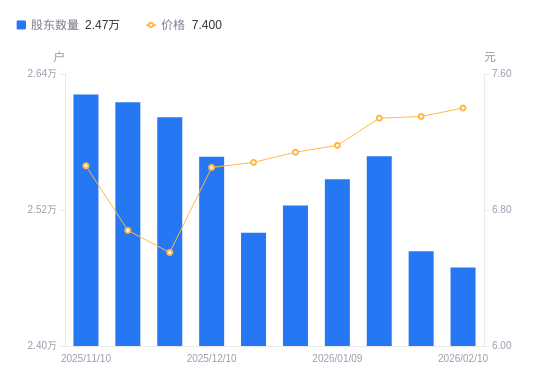 近一年(2025年2月10日至2026年2月10日),润邦股份A股股东户数从3.29万户,减低至2.47万户,降幅24.94%,区间股价上涨25.85%。