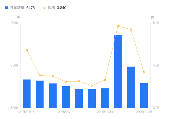 近一年(2024年12月20日至2025年12月19日),ST雪发A股股东户数从6031户,增加至6478户,增幅7.41%,区间股价上涨13.27%。