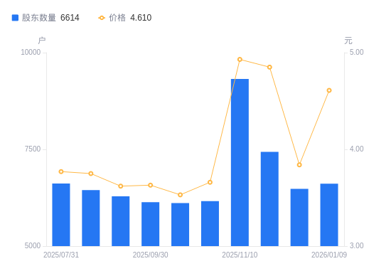 近一年(2025年1月10日至2026年1月9日),ST雪发A股股东户数从5902户,增加至6614户,增幅12.06%,区间股价上涨60.07%。