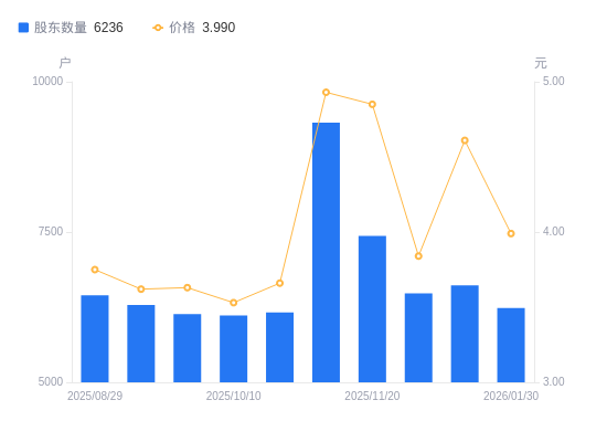 近一年(2025年2月10日至2026年1月30日),ST雪发A股股东户数从5985户,增加至6236户,增幅4.19%,区间股价上涨45.62%。