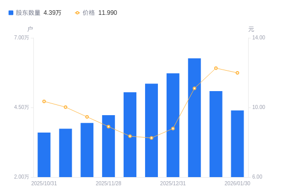近一年(2025年1月20日至2026年1月20日),金固股份A股股东户数从3.41万户,增加至5.09万户,增幅49.25%,区间股价上涨9.37%。