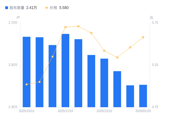 近一年(2025年1月20日至2026年1月20日),华斯股份A股股东户数从2.99万户,减低至2.41万户,降幅19.56%,区间股价上涨47.62%。