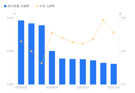 近一年(2024年12月20日至2025年12月20日),*ST辉丰A股股东户数从4.59万户,减低至2.92万户,降幅36.43%,区间股价下跌28.02%。
