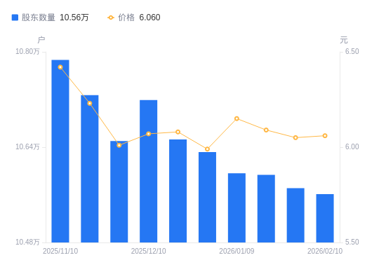 近一年(2025年2月10日至2026年2月10日),山西证券A股股东户数从12.28万户,减低至10.56万户,降幅14.01%,区间股价下跌0.98%。