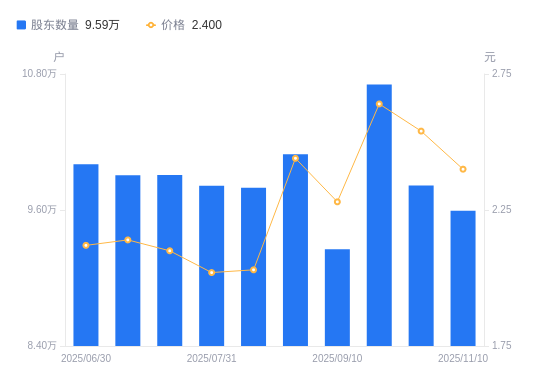 近一年(2024年11月20日至2025年11月10日),利源股份A股股东户数从11.92万户,减低至9.59万户,降幅19.55%,区间股价上涨38.73%。
