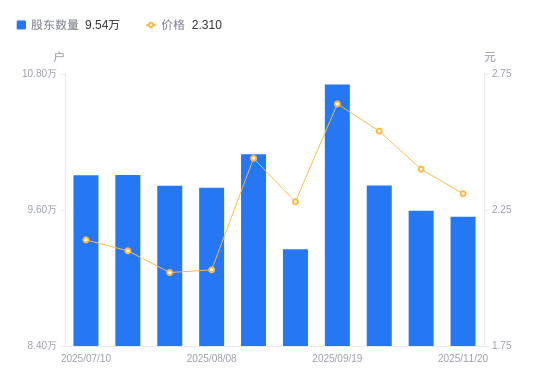 11月24日消息,数据显示,截至2025年11月20日,利源股份A股股东总户数为9.54万户,较上期(2025年11月10日)减少517户,降幅0.54%。公司最新A股总股本为35.5亿股,其中流通A股35.46亿股,户均持有流通A股数量为3.72万股,较上期增加200.33股,增幅0.54%;户均持流通A股市值8.59万元,较上期减少2864.58元,降幅3.23%。