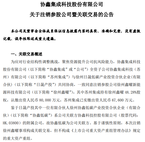 11月21日,协鑫集成(002506)公告称,为应对行业结构性调整挑战,聚焦资源提升公司抗风险能力,决定注销其参股公司徐州鑫曜新能源科技有限公司。