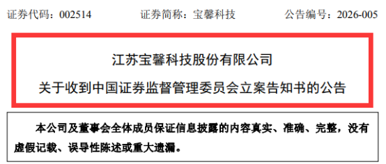 1月31日,宝馨科技(002514.SZ)发布公告,公司及实际控制人马伟于近日收到中国证监会下发的《立案告知书》,因涉嫌信息披露违法违规,中国证监会决定对公司及马伟立案调查。