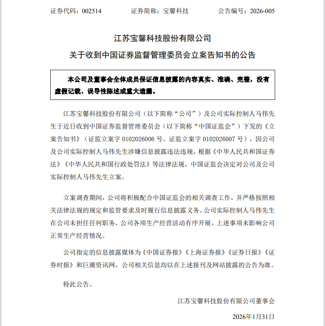 公告显示,因涉嫌信息披露违法违规,中国证监会决定对公司及实控人马伟立案。宝馨科技于公告中表示,公司实控人马伟在公司未担任任何职务,公司各项生产经营活动有序开展,上述事项未影响公司正常生产经营。