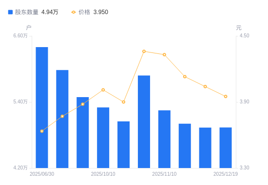 近一年(2024年12月31日至2025年11月30日),天桥起重A股股东户数从7.67万户,减低至4.93万户,降幅35.68%,区间股价上涨22.98%。