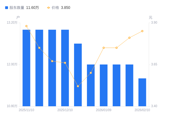 2月12日消息,数据显示,截至2026年2月10日,山东矿机A股股东总户数为11.6万户,较上期(2026年1月30日)减少4000户,降幅3.33%。公司最新A股总股本为17.83亿股,其中流通A股17.71亿股,户均持有流通A股数量为1.53万股,较上期增加508.93股,增幅3.45%;户均持流通A股市值5.88万元,较上期增加2549.75元,增幅4.53%。