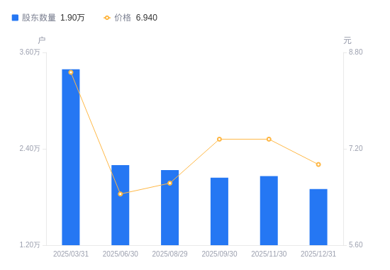 2月4日消息,数据显示,截至2025年12月31日,*ST海源A股股东总户数为1.9万户,较上期(2025年11月30日)减少1600户,降幅7.77%。公司最新A股总股本为2.6亿股,其中流通A股2.6亿股,户均持有流通A股数量为1.37万股,较上期增加1062.85股,增幅8.42%;户均持流通A股市值9.5万元,较上期增加2075.22元,增幅2.23%。