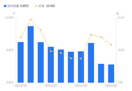 近一年(2025年1月27日至2026年1月20日),金财互联A股股东户数从12.12万户,减低至8.92万户,降幅26.34%,区间股价下跌2.91%。