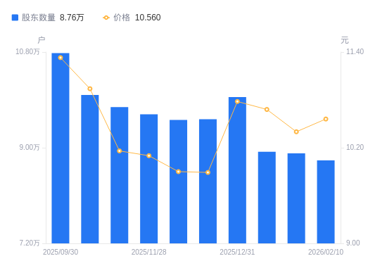 近一年(2025年2月10日至2026年2月10日),金财互联A股股东户数从12.92万户,减低至8.76万户,降幅32.22%,区间股价下跌13.65%。