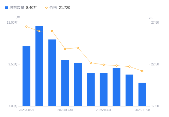 12月1日消息,数据显示,截至2025年11月28日,飞龙股份A股股东总户数为8.4万户,较上期(2025年11月20日)减少5000户,降幅5.62%。公司最新A股总股本为5.75亿股,其中流通A股5.44亿股,户均持有流通A股数量为6481.16股,较上期增加364.11股,增幅5.95%;户均持流通A股市值14.08万元,较上期增加4666.43元,增幅3.43%。