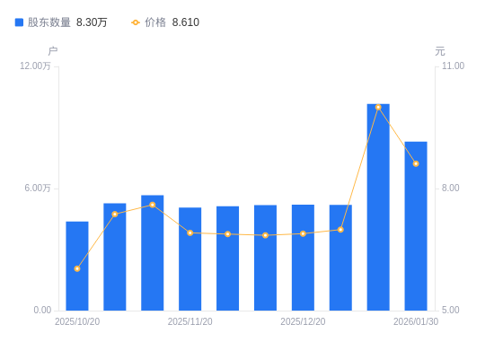 2月13日消息,数据显示,截至2026年2月10日,新联电子A股股东总户数为8.38万户,较上期(2026年1月30日)增加800户,增幅0.96%。公司最新A股总股本为8.34亿股,其中流通A股8.01亿股,户均持有流通A股数量为9561.24股,较上期减少92.16股,降幅0.95%;户均持流通A股市值8.68万元,较上期增加3700.32元,增幅4.45%。
